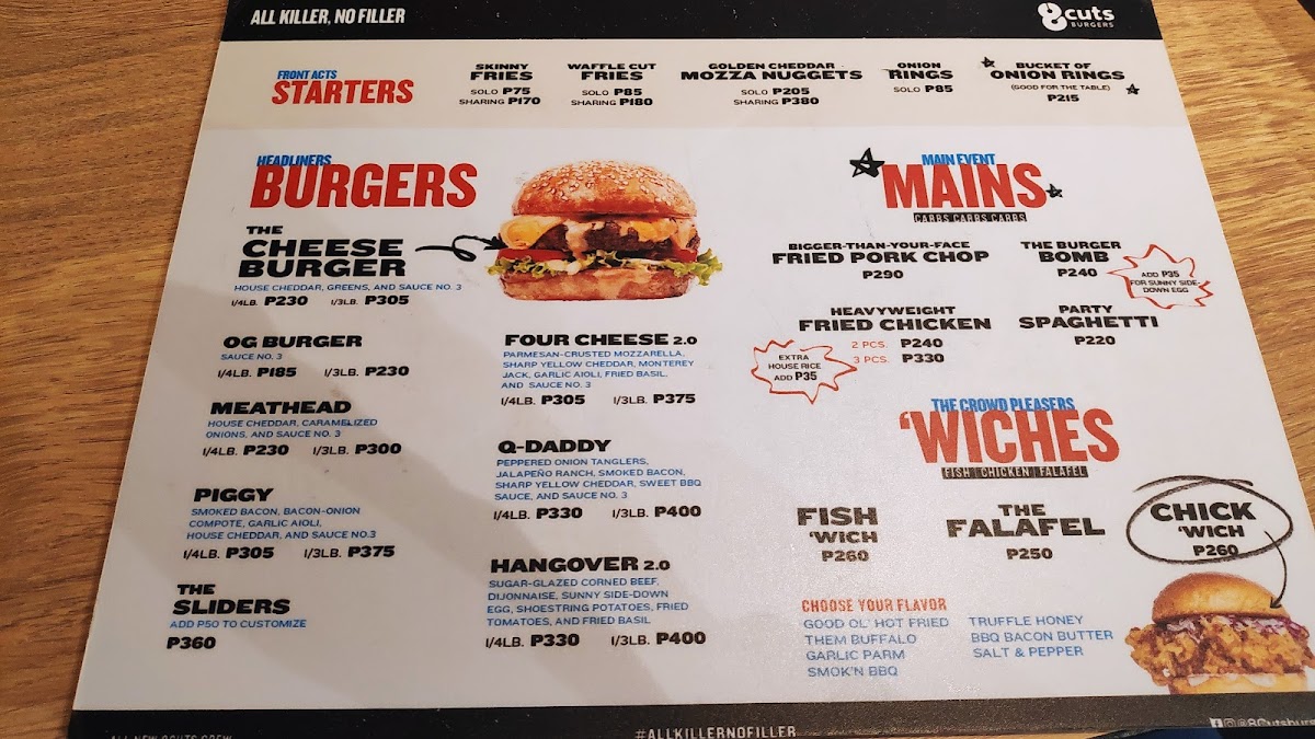 Welcome to 8 Cuts Burger Blends, a burger haven nestled in the heart of Alabang Town Center, Muntinlupa City, Philippines. This vibrant eatery is celebrated for its creative approach to classic American burgers, with customer favorites that include the indulgent Q-Daddy Burger and the mouthwatering Chick Poppers in BBQ Bacon Butter.
